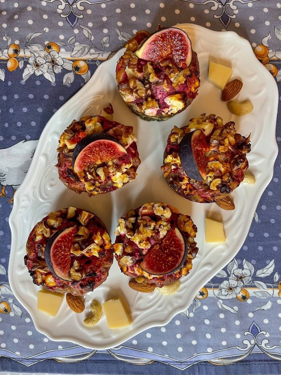 МАФФИНЫ СО СВЕКЛОЙ, СЫРАМИ И ОРЕХАМИ Нам понадобится: 🍂 Брынза 100г 🍂 Грецкие орехи 40г 🍂 Яйца 3 шт. 🍂 Базилик сушёный 1,5 ч. ложки 🍂 Растительное масло 120 мл 🍂 Мука 160г 🍂 Свёкла 3 штуки среднего размера запеченные или отварные. Можно использовать сырую! Но тогда выпекаем на 5-7 минут дольше 🍂 Сливочное масло 10г 🍂 Разрыхлитель 1 ч. ложка 🍂 Сахар 60г (можете не использовать, я не использовала) 🍂 Сода ½ ч. ложка 🍂 Соль Приготовление: 👉 В миску разбить 3 яйца, налить 120 мл растительного масла и взбить миксером. 👉 Добавить сахар к яйцам и взбить миксером (если будете использовать). 👉 Смешать сухие ингредиенты: 150г муки, соду, разрыхлитель и щепотку соли. 👉 Медленно всыпать сухие ингредиенты к яйцам и смешать миксером до однородной консистенции. 👉 Натереть на крупной тёрке сырую очищенную свёклу и перемешать с тестом. 👉 Добавить в тесто сушёный базилик и перемешать. 👉 Смазать сливочным маслом дно и борта форм для кексов и посыпать мукой. 👉 Переложить тесто в формочк