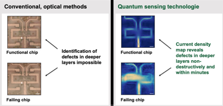 Результаты измерений основаны на измерениях квантового зондирования. В то время как оптические измерения не могут идентифицировать дефекты в более глубоких слоях, карты плотности тока, считываемые квантовыми датчиками, могут неразрушающим образом обнаруживать дефекты. (Источник: Quantum Diamonds)