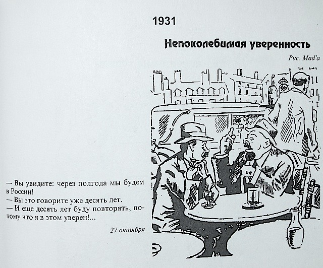 Наблюдения за деятельностью современной, пятой колонны волны эмиграции из России, и самой первой её волной, после 1917 года, наводят на мысль, что между ними — немало общего. Вот в качестве иллюстрации — подборка карикатур парижского эмигрантского художника Михаила Дризо (1887—1953), он же MAD, о жизни эмигрантов, из журнала «Иллюстрированная Россия». Так сказать, русская эмиграция глазами самих эмигрантов. А о сходстве или различии их жизни с нашими современниками каждый может судить сам...
