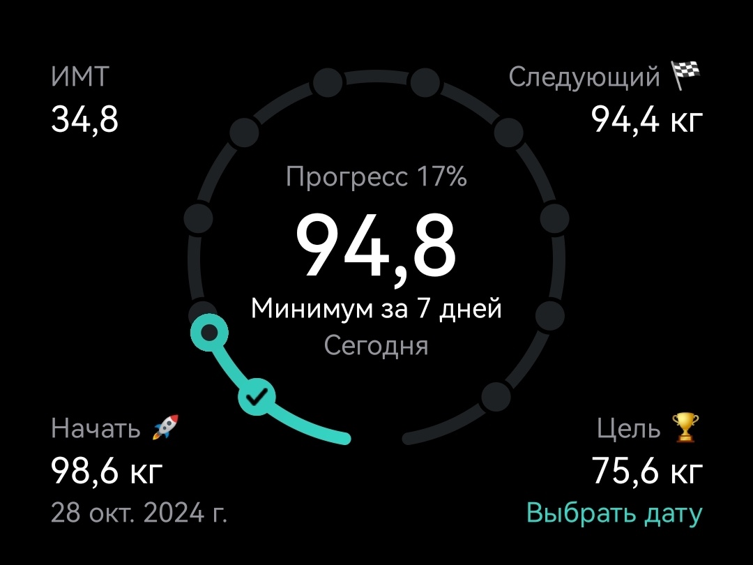 Я подумала, что можно установить некую мотивацию, например, покупать что-то для себя на определённый вес. Надо об этом подумать. За неделю я похудела на 0,7 кг, что считаю нормальным, особенно учитывая, что я не ограничиваю себя жёстко в еде. Я всё ещё нацелена на длительное похудение и никуда не спешу. Хотя было бы прекрасно сбросить ещё 5 кг к Новому году, но такую цель я не ставлю. Как получится, так и будет. Из новостей: мой сын сел! 🎉 Я так давно этого ждала, а потом он, к сожалению, недоспал и ревел час, до сих пор у меня в ушах звенит. Тут подруга написала мне в комментариях, что за уборку она проходит 8 тысяч шагов. Не знаю, может, если бы я убиралась одна и не отвлекалась, да и вообще занималась именно уборкой, а не делала много мелких задач, то тоже могла бы пройти столько шагов. Но, как я написала, я делаю мелкие дела каждый день, а убираемся мы с мужем по выходным. Хотя, конечно, он больше занимается самой уборкой, а я в основном готовлю. 🤗 Еда 👍 Шаги🤷🏼 я хотела по
