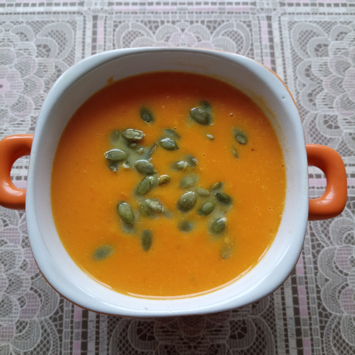 На завтрак я приготовила тыквенный крем-суп. Вчера вечером сварила тыкву, утром быстро её превратила в пюре. Прокипятила с молоком и специями. Всё, суп готов! Муж такое не будет есть ни за какие коврижки. Я же обожаю этот вкус. Так как я всегда все рецепты адаптирую под себя, облегчая себе готовку, то и этот суп быстро адаптировала. В этом супе из рецепта только тыква, специи и вместо сливок молоко. Больше я ничего туда не добавляю. И, поверьте, он ничем не отличается от того, который я готовила по оригинальному рецепту. Тыквенные семечки у меня есть, но можно и без них обойтись. В общем, кто любит тыкву, тот поймёт, что это вкусно.