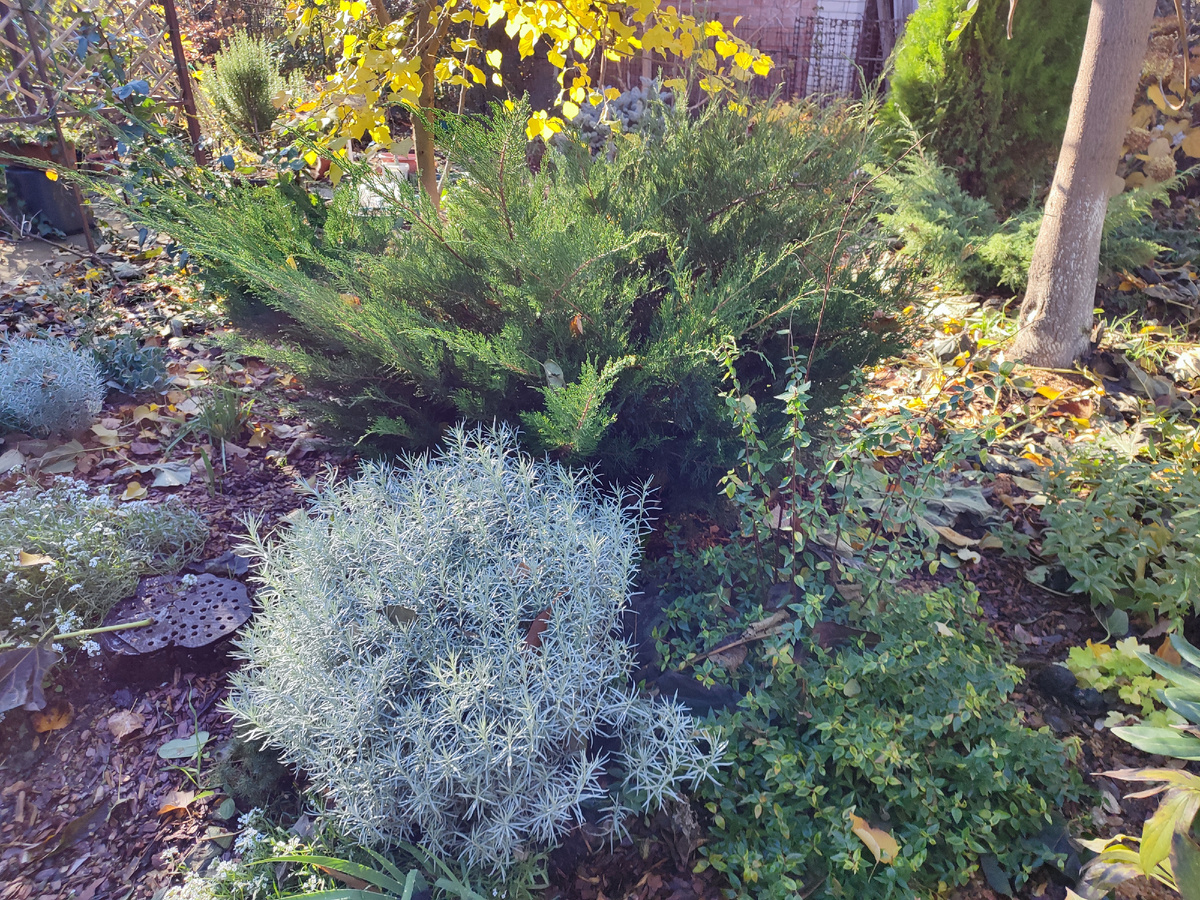 Мой самых любимый можжевельник - можжевельник даурский Ленинград. Я не знаю, чем он меня цепляет. Но это так. Растет в глубине, но у меня часто возникает желание пойти и потрогать его, убрать с него листья, которые нападали... С другими можжевельниками такого нет. То ли он создает ощущение натурального дикого подлеска вместе с эрикой и кипарисовиками на заднем плане, то ли он просто аккуратный, "сбитый", я бы сказала "аккуратно причесанный". И еще шишки у него съедобные, их добавляют при приготовлении блюд. Я не любитель вкуса хвои в блюдах, поэтому я не пользовалась его шишками. Но для информации у других можжевельников шишки ядовитые. Подходит для переднего плана.