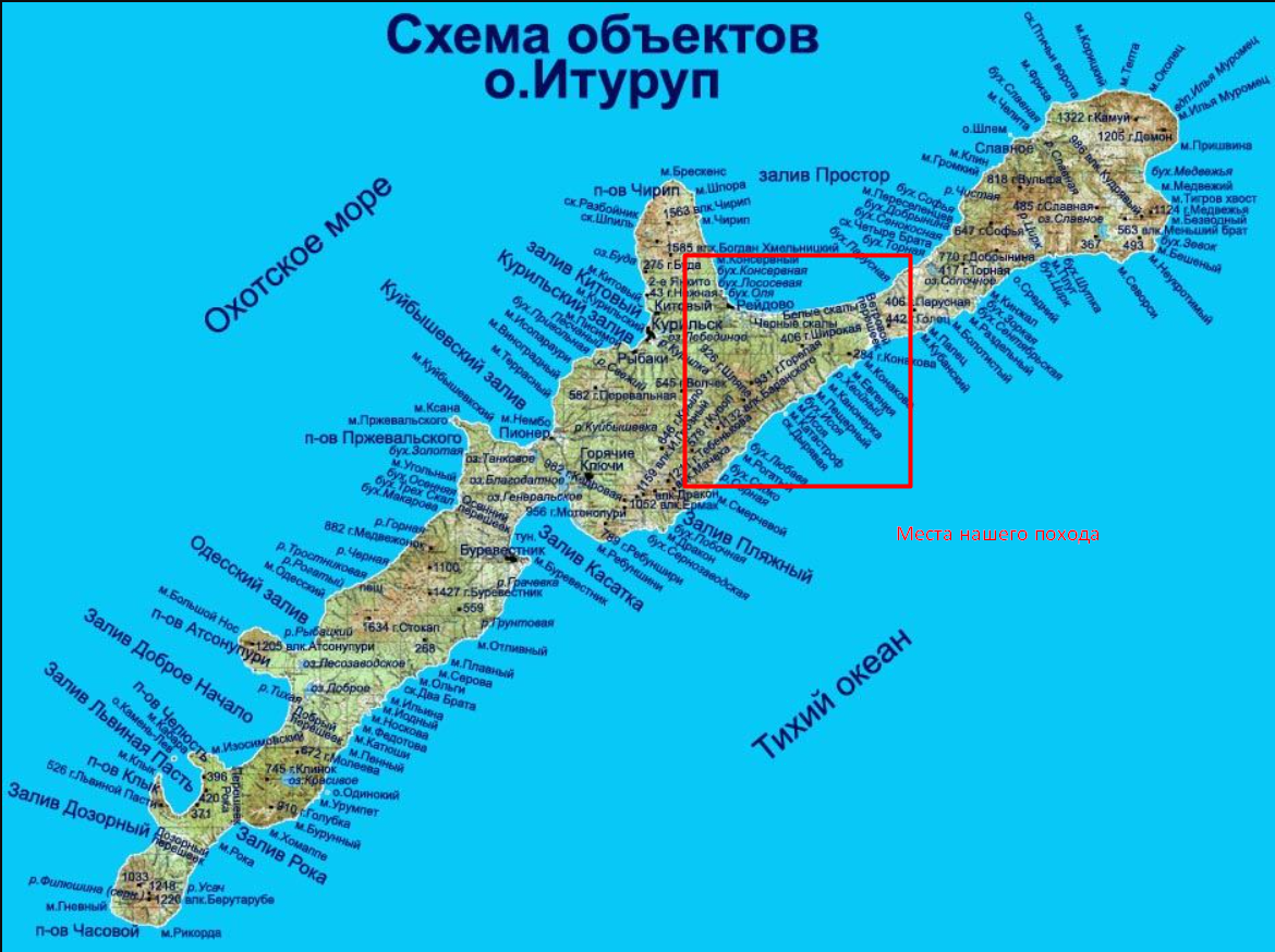 Посмотрев разные варианты, пришел к выводу, что наиболее удобной для относительно несложного недельного пешего похода является северо-восточная часть острова, где, находятся, собственно, Белые скалы, Ветровой перешеек, мыс Исоя и вулкан Баранского. От этого уже можно "плясать". Ещё одна большая сложность - пресная вода. На Итурупе присутствует достаточно серьезная вулканическая активность, и следы этой активности активно (извиняюсь за тавтологию) попадают в реки и ручьи делая их непригодными для питья и приготовления пищи, а оставшиеся пресными и питьевыми ручьи и реки иногда пересыхают. Информацию о питьевых ручьях можно найти в немногочисленных отчетах, ну и я ниже постараюсь дать актуальную информацию.