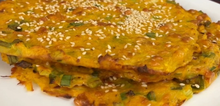 Замечательные тыквенные лепешки, которые могут заменить вам хлеб, а могут стать сытным и вкусным перекусом. Ингредиенты: 500 г тыквы, 100 г твердого сыра, 1 пучок зеленого лука 2 яйца, 2 ст. л. муки, 1 ст. л. разрыхлителя, 100 г сметаны, паприка, соль, перец, кунжут (для посыпки). Приготовление: тыкву потереть на мелкой терке, сыр – на средней терке, лук мелко порезать. Все ингредиенты (кроме кунжута) смешать в одной посуде, вбить яйца, смешать. По консистенции масса будет напоминать массу для кабачковых оладий. Противень застелить пергаментной бумагой. Столовой ложкой положить часть массы на пергаментную бумагу и сформировать небольшие тонкие лепешки. Сверху каждую лепешку слегка присыпать кунжутом. Запекать в духовке 15 минут при 180С. Подавать можно с первыми блюдами или самостоятельно.