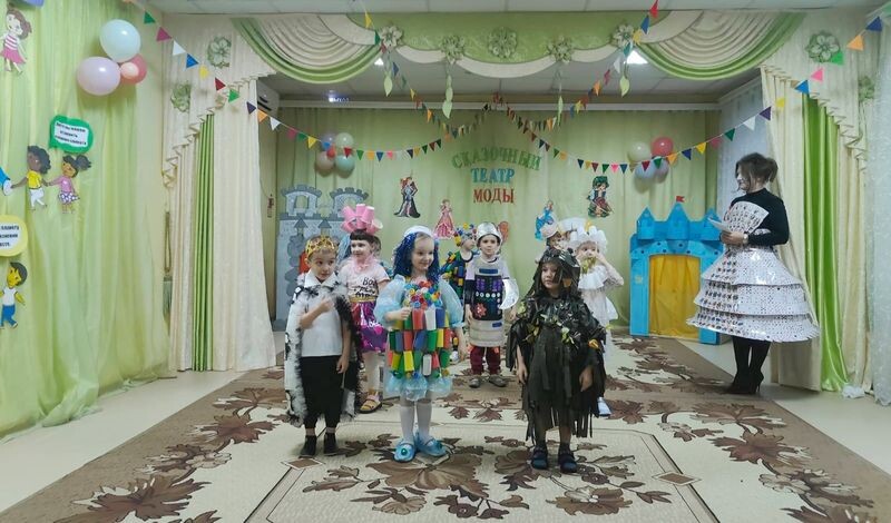 Костюмы из бросового материала - пакетов, картонок, стаканчиков, строительного и ремонтного мусора, деталей конструктора, природных материалов и крышек от детского питания - демонстрировали ребята из старше-средней группы. Праздничный показ дизайнерских моделей был посвящён театру и борьбе с экологическим кризисом, который охватил сегодня всю планету. Нарядились все, и дети, и педагоги: они были Рукодельницей и Карточной королевой. На костюм девочки-Дворянки пошли утеплительные трубы, из подручных материалов был сделан корсет и сумочка; искусно выполнен костюм Русалки; из стаканчиков был выполнен косюм Куклы, из стройматериалов - костюм Ракеты, очень сложные в исполнении были костюмы Лего-людей; Фея всех поразила пышными рукавами из пакетов; на костюм Шахматного короля пошла старая рубашка папы; удались костюмы Королевы и Принцесс, а костюм Лешего, украшенный веточками и ягодами, очень напоминал костюм разведчика СВО.