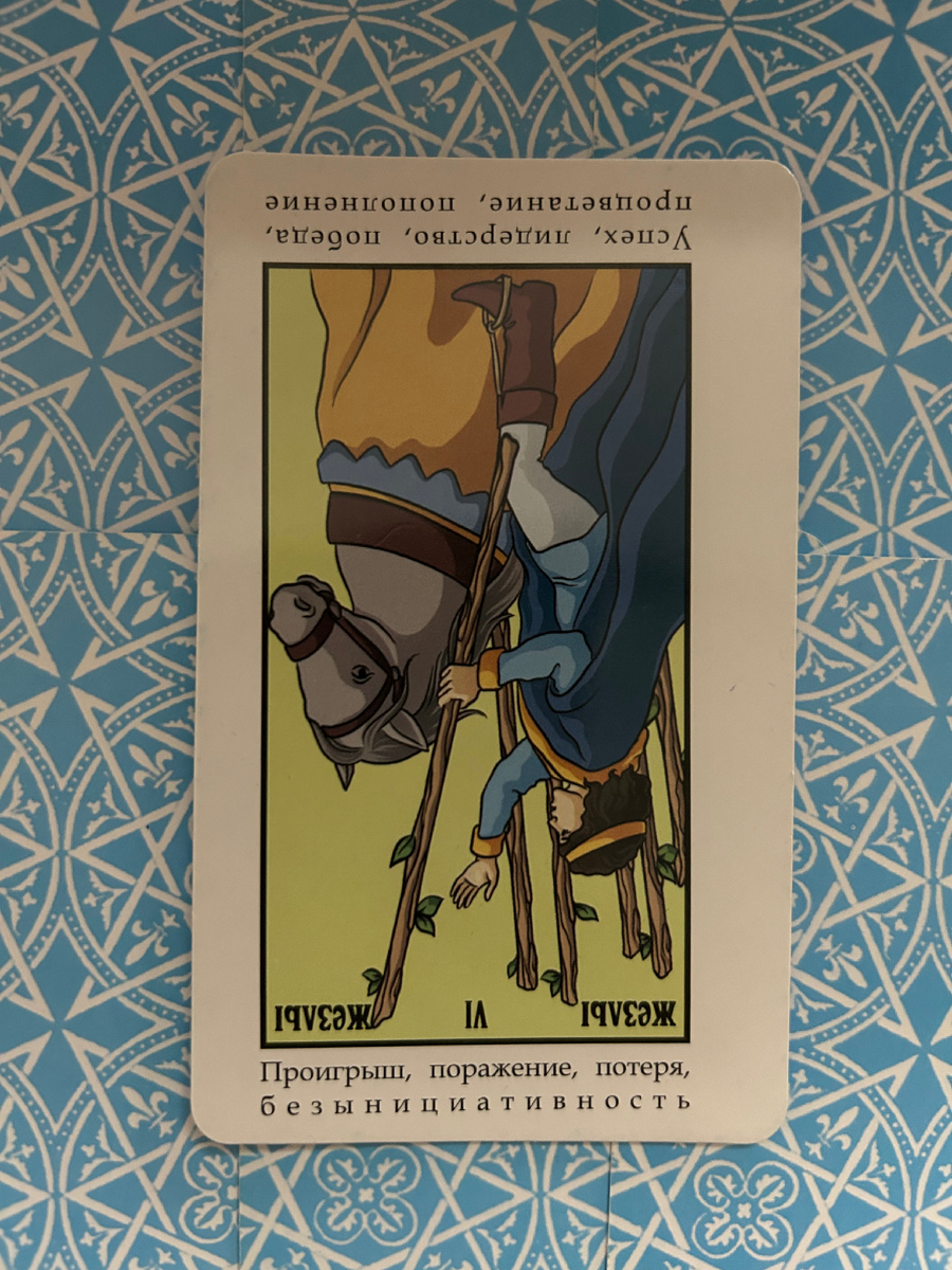 В прямом положении Шестёрка Жезлов — это карта победы, признания и триумфа. Она говорит о заслуженном успехе, уверенности и поддержке окружающих. Однако у каждого аркана есть и обратное значение, которое показывает сложности, связанные с потерей уверенности, недооценкой достижений или отсутствием поддержки. Напоминаем: читать карту перевёрнутой необязательно, но понимание её противоположного смысла помогает глубже проанализировать расклад и учесть все детали. В перевёрнутом положении карта может указывать на чувство неудачи, отсутствие признания или на то, что успех оказался временным и недолговечным. Это также может быть сигналом о завышенных ожиданиях или зависти со стороны окружающих. 1. В работе и бизнесе: Карта может указывать на разочарование из-за того, что ваши профессиональные достижения не признаны. Это также может быть сигналом о том, что проект оказался менее успешным, чем ожидалось, или что в коллективе есть зависть и интриги. 2. В отношениях: Перевёрнутая Шестёрка Жезл