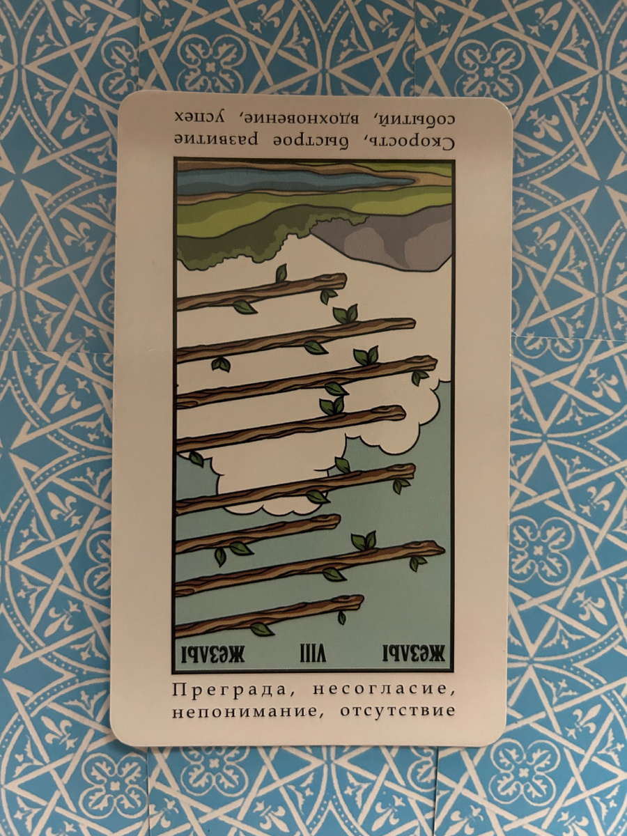 В прямом положении Восьмёрка Жезлов — это карта быстрого прогресса, движения вперёд, внезапных изменений и вдохновения. Она символизирует энергию, скорость и успешное завершение дел. Однако у любого аркана есть и обратное значение, которое может отражать замедление, хаос или отсутствие ясности. Напоминаю: читать карту перевёрнутой необязательно, но понимание её противоположного смысла позволяет глубже анализировать расклад и избегать неправильных интерпретаций. Перевёрнутая карта может указывать на задержки, несогласованность действий или отсутствие направления. Вы можете чувствовать, что стоите на месте, или столкнуться с ситуациями, где хаос мешает добиться успеха. 1. В работе и бизнесе: Перевёрнутая Восьмёрка Жезлов может указывать на задержки в проектах, проблемы с коммуникацией или несогласованность в команде. Возможно, вам нужно пересмотреть план действий, чтобы устранить хаос. 2. В отношениях: Карта может говорить о внезапных разрывах, недоразумениях или замедлении развития
