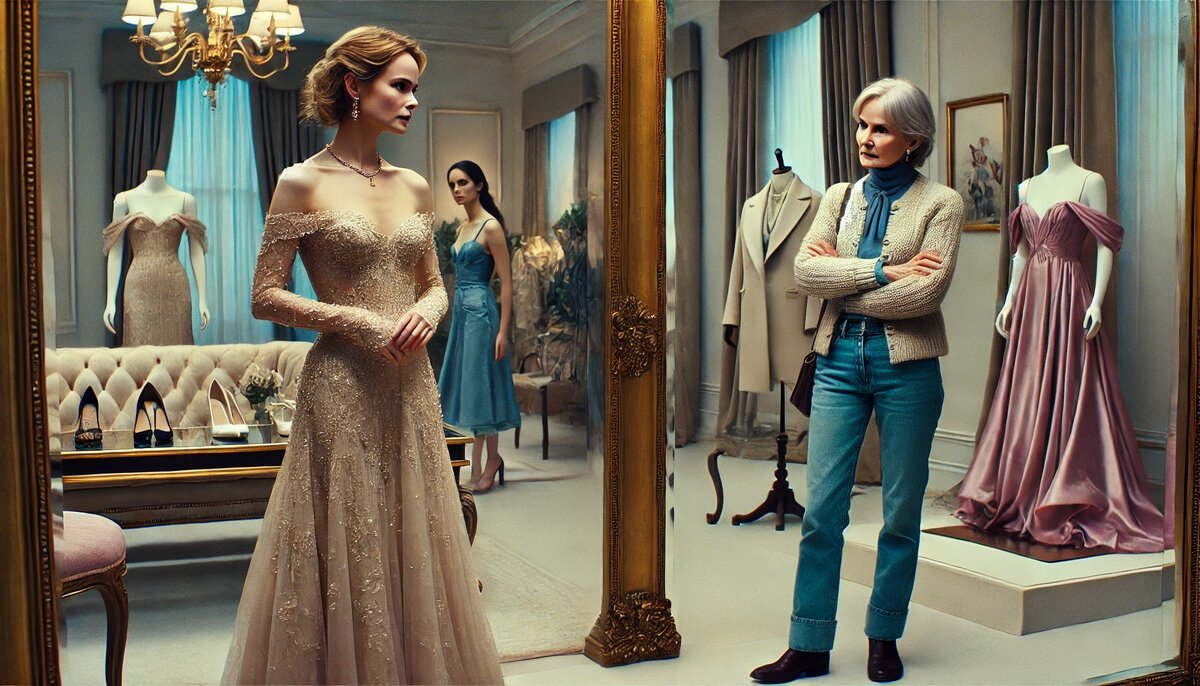 Бутик встретил её яркими витринами и шуршанием дорогих тканей. Катя выбрала несколько платьев: красное с открытыми плечами, изумрудное в пол и нежное белое. Она взглянула в зеркало, и её отражение заставило замереть.