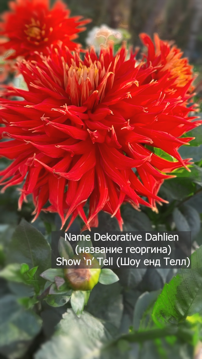 Высота растения : 120- 130cm Размер цветка: 20-25см Сорт зарегистрирован селекция Almand, Jack (USA), 1985г Георгина Шоу Энд Телл — великолепный американский сорт с гигантскими цветками «огненной» оранжево-красно-желтой расцветки. Бахромчатый георгин с крупными густо-махровыми цветками, которые имеют узкие лепестки, свернутые у основания и рассеченные на краях. За счет этого цветок смотрится по-настоящему пышно и великолепно! И как всегда размер имеет значение , поэтому тут нужно отметить размер цветка 20-25 см и более. Крупноцветковый гигант! Куст мощный, ветвистый, высотой 120-130см. Цветоножка прекрасно держит цветок, идеально подходит для срезки. В зависимости от солнца и расположения на участке может преобладать желтый цвет в соцветии. Полный видео обзор у меня на канале.