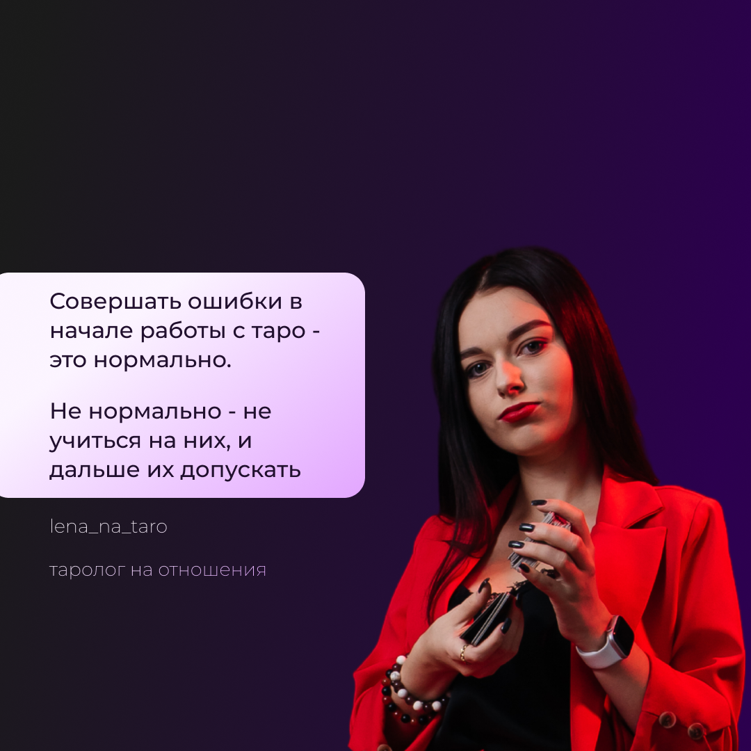 Купил колоду таро, и теперь думаешь, что будешь брать большие деньги и жить в шоколаде? Сначала прочитай статью, исправь ошибки, и тогда уже можно!👇 🔮Меня зовут Лена, и я таролог на отношения, вот уже 5 лет я делаю расклады направленные на помощь многим девушкам и мужчинам, у которых проблемы в отношениях и у которых постоянно всплывают мысли "а может расстаться? У нас пропала искра и он от меня отдалился". И только спустя пять лет работы в этой профессии, я поняла, что многие не хотят брать расклады, потому что боятся, что кто-то узнает о них личную информацию и распространит. Как бы я ни старалась доказать, что моя работа строго конфиденциальна - все равно у некоторых этот страх остался. И тогда я начала обучать тех, у кого было желание узнать что-то у карт, но как раз из-за страха, не могли этого сделать. Собрав небольшую группу учениц, которые уже что-то читали про таро, я стала изучать их ошибки. И поняла, что в начале своего пути - я совершала те же ошибки, что и они. Тогда я