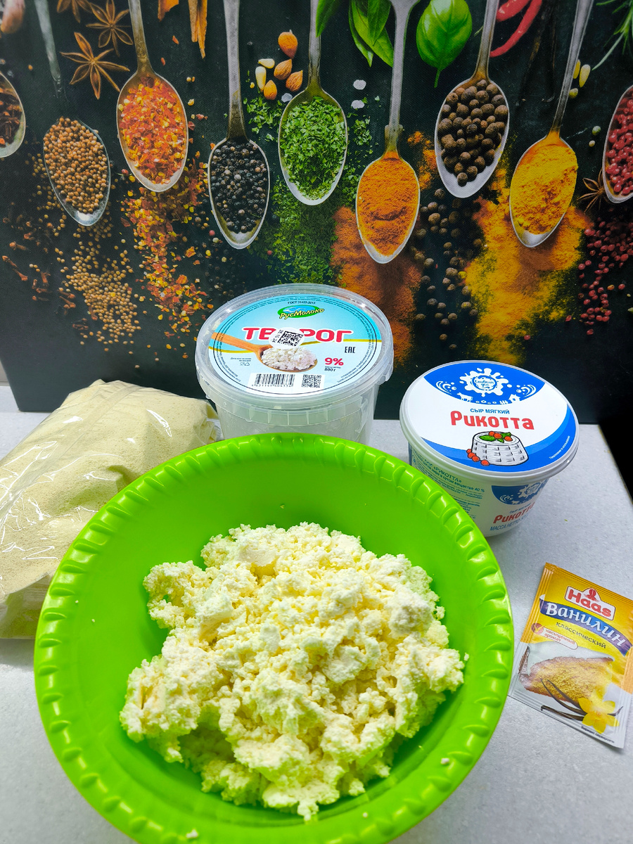 👨🍳Ингредиенты: ✔️сыр "Рикотта" - 250 г; ✔️творог (меня - жирностью 9%) - 350 г; ✔️куриные яйца - 2 шт.; ✔️манная крупа - 1,5 ст. л.; ✔️сахарная пудра (или сахар) - 100 г; ✔️ванильный сахар - 10 г; ✔️соль - 1 щепотка; ✔️масло растительное - 1 ст. л. (для смазывания формы). 👨🍳 Начинаем готовить: ✅Подготовьте необходимые ингредиенты. Творог, сыр и яйца достаньте из холодильника, примерно, минут за 30 до начала приготовления. Творог лучше брать достаточно сухой. Если в рикотте есть немного сыворотки, тогда аккуратно слейте её. ✅В подходящей посуде смешайте творог и сыр "Рикотта". ✅К смеси творога и рикотты добавьте яйца, сахарную пудру (или сахар), ванильный сахар и соль, перемешайте. ✅Добавьте манную крупу. ✅Тщательно перемешайте творожно-сырную массу и оставьте при комнатной температуре минут на 15, чтобы манка набухла. ✅Форму для выпечки (лучше взять форму диаметром 16-18 сантиметров с бортиками высотой 3-4 сантиметра) смажьте растительным маслом, выложите творожно-сырную ма