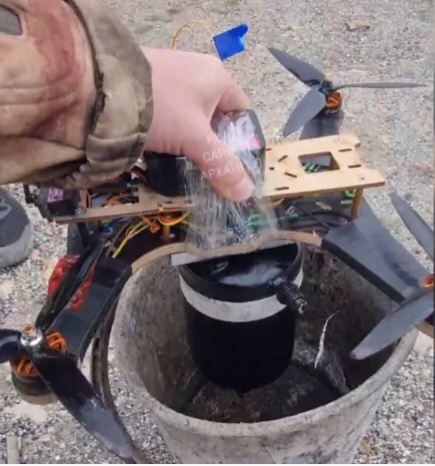 Российский инженерный проект "Архангел" представил новую зажигательную систему "Горыныч 2.0" для вооружения FPV-дронов. Устройство представляет собой емкость с зажигательной смесью весом 1,5 кг, системой воспламенения и двумя небольшими металлическими швеллерами. С помощью последних оно приматывается к FPV-дрону скотчем. Беспилотник взлетает со стартовой платформы в виде ведра, внутри находится увесистая емкость со смесью.