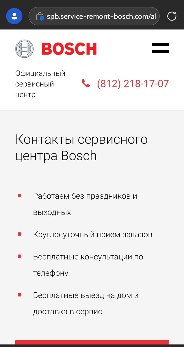 Прошу обратить внимание всех на данный сайт , отношения к компании Bosh он не имеет вообще. Будте внимательны !!! https://spb.service-remont-bosch.com/ Вот тут отзывы почитайте ,очень странно почему их не закроют https://otzovik.com/reviews/servisniy_centr_bosch_service_russia_sankt-peterburg/ Вот тут ещё https://irecommend.ru/content/ofitsialnyi-servisnyi-tsentr-bosch-kotorogo-net