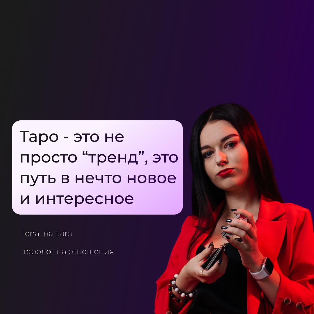 Меня зовут Лена_на_Таро, да, вполне себе логичное и странное для меня имя. Но я связала свою жизнь с картами целиком и полностью, и ни разу не пожалела. Я не гналась за трендами, я просто нашла свой путь в жизни. И теперь я обучаю тех, кто хочет изучить эту тему на максимум.