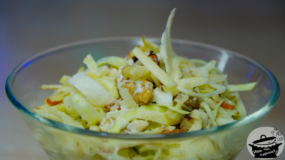 капусту мелко пошинковать, яблоко натереть на тёрке, орехи порубить. Смешать ингредиенты, заправить сметаной, солью и лимонным соком.