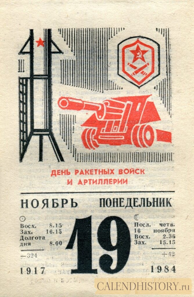 Итак, сегодня 19-го ноября и у нас на календаре 1984-й год. Перед нами листок советского календаря для женщин за этот день. На календаре у нас понедельник - 19 ноября 1984-го года. ДЕНЬ РАКЕТНЫХ ВОЙСК И АРТИЛЛЕРИИ *** Оборотную сторону листка этого календаря можно посмотреть у нас по ссылке на сайте. Другие листки советских календарей смотрите у нас на сайте - CALENDHISTORY.ru ДРУГИЕ ЛИСТКИ ОТРЫВНЫХ КАЛЕНДАРЕЙ: