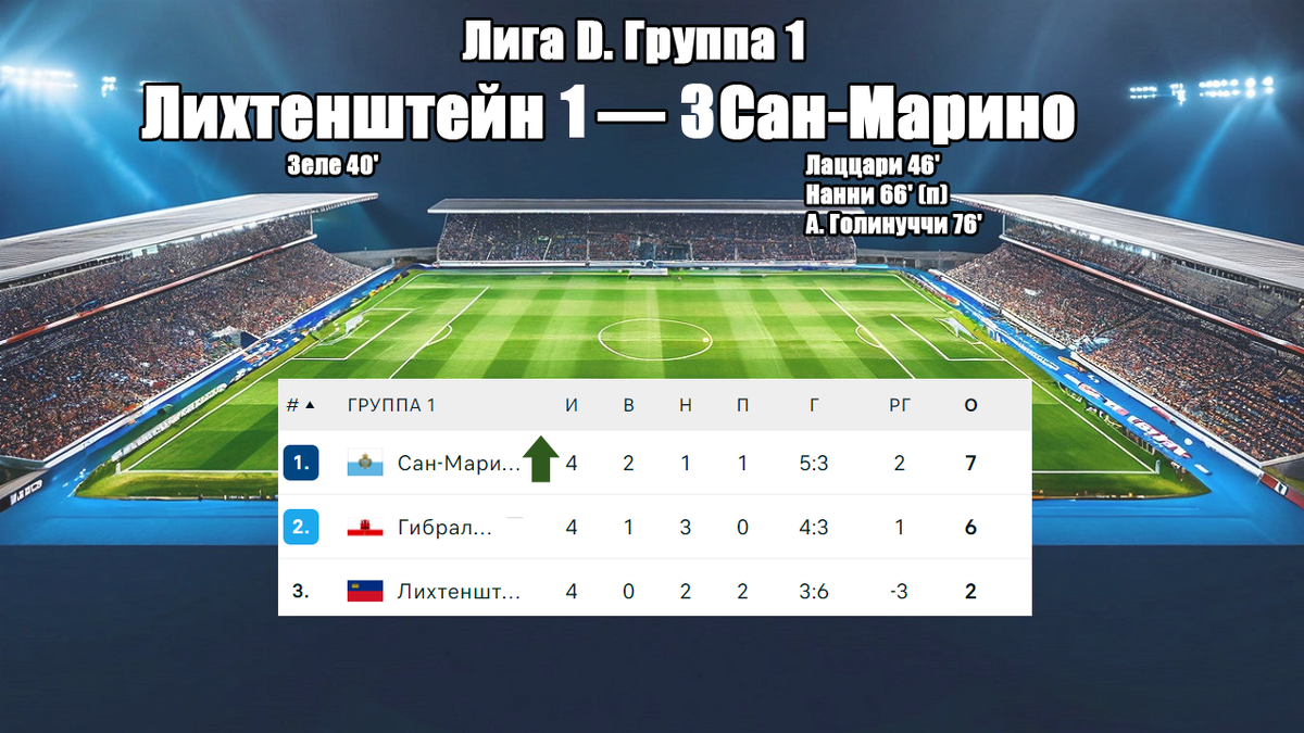 Здравствуйте, уважаемые любители футбола. Этой ночью в пяти группах Лиги Наций завершён групповой этап. Смотрим их результаты и радуемся за повышенных. Группа D1. Открываем обзор результатом Лихтенштейна и Сан-Марино. (Проще говоря встречались 200-я и 210 команды рейтинга ФИФА). Сборная Сан-Марино в этом турнире забила 5 мячей! Показала всем язык и получила повышение в дивизион С. Группа С3. Беларусь сохранила место в дивизионе. Группа С2. Группа А1. Группа А4. Список лучших бомбардиров и ассистентов: Холанд и Марин забили по 7 мячей. Дьёкереш (Швеция) имеет 5 передач. Расписание на 19 ноября. (Заключительный день всего турнира). Если статья зашла, вам необходимо подписаться. Завтра узнаем последние результаты 6 тура. До встречи на «спортивном».