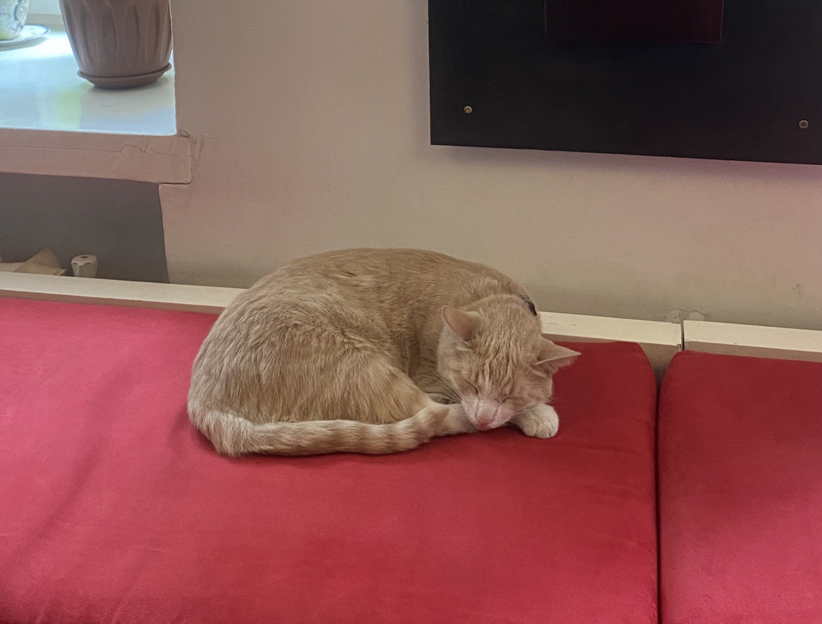 На первом этаже вы попадаете в привычную обстановку современного мира. Висят новые плакаты и вывески, лежит красный ковролин, есть гардероб и кафетерий. У окна расположены красные пуфики и столики, на которых отдыхают котики, а женщины наслаждаются чашечкой кофе.