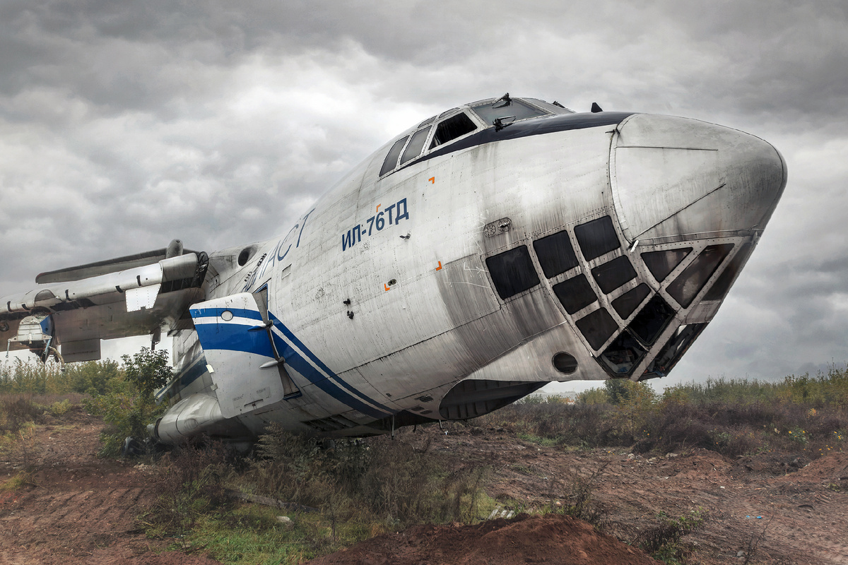 Так как на оставшиеся самолёты всем было плевать, попасть к ним оказалось совсем не сложно. И одним пасмурным осенним днём, я приступил к знакомству с последними самолётами аэропорта Быкова. Начал я со стоявшего в гордом одиночестве, уже не летательном аппарате, ИЛ-76ТД. Его бортовой номер сохранился, поэтому можно узнать подробности о самолёте и почему он оказался в этом месте никому не нужный.