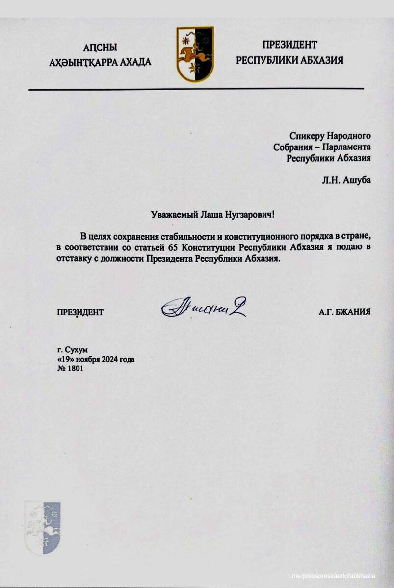 📌 Также уточняется, что протестующие должны покинуть правительственный комплекс Абхазии 19 ноября, иначе Бжания отзовет заявление об отставке.