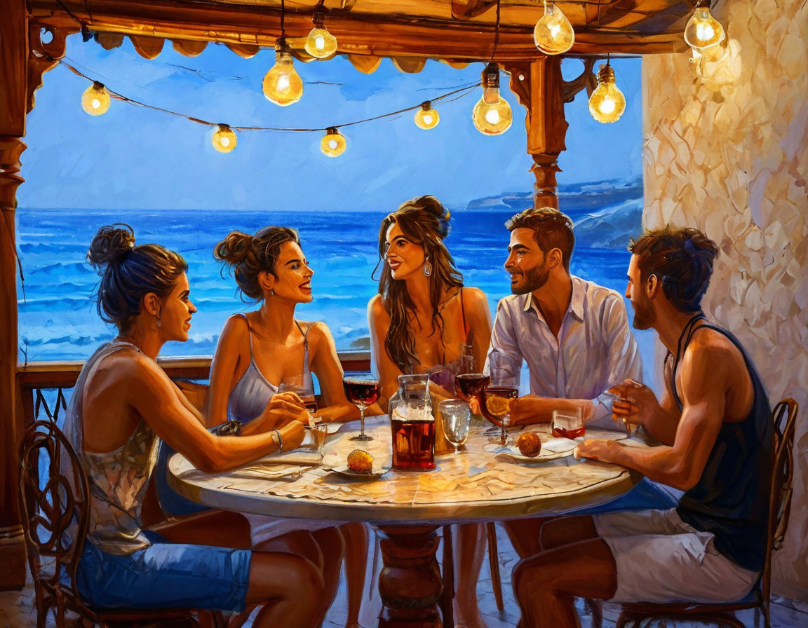 Ребятки пришли к закату. Кьяра вошла последней, в легком платье, которое слегка колыхалось на сквозняке, подчёркивая её тонкую талию и стройные ноги. Зелёные глаза встретились с моими, и в этом взгляде было нечто, что разбудило внутри меня какое-то новое чувство, ранее которое я не испытывал. Вечер начался спокойно: ребята расселись на террасе, где в воздухе витали запахи свежих морепродуктов и специй. Бокалы наполнялись местным вином, а разговоры постепенно становились громче. Закат раскрасил небо в ярко-оранжевые и розовые тона, и момент казался идеальным. Кьяра сидела напротив, её зелёные глаза мерцали в мягком свете фонариков, которые я развесил по краям террасы. — Чёрт, ты устроил здесь настоящий рай, — засмеялся кто-то из ребят, поднимая бокал. — Все для вас. — усмехнулся я, но мой взгляд всё время возвращался к Кьяре. Она заметила это, и наши взгляды пересеклись на долю секунды дольше, чем обычно. Музыка стала медленнее, и кто-то предложил танцевать. Мы все поднялись, а