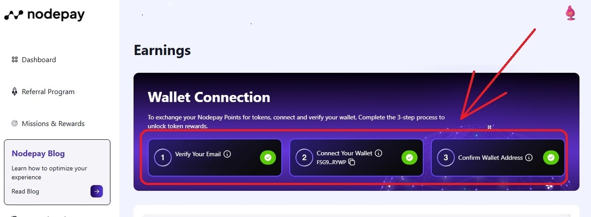 Подключаем Solana-кошелек На платформе появилась новая функция — подключение Solana Wallet! Это важный шаг для получения Airdrop, поэтому выполните все действия: Пошаговая инструкция: 1. Переходим на Nodepay. https://app.nodepay.ai/register?ref=Vj5GJ3uLaAtELDI 2. Открываем вкладку " Earnings" 3. Подключаем кошнелек Соланы (например Phantom Хроме chrome://extensions/?id=bfnaelmomeimhlpmgjnjophhpkkoljpa) 4. Подтверждаем на почте Missions & Rewards https://app.nodepay.ai/missions Подключаем Twitter, Discort Nodepay сообщили, что он пригодится на этапе TGE, так что не откладывайте. Откройте вкладку "Medal & Boost" и заберите бейдж. Как минимум медалька что Вы человек должна стать активной, если же она осталась серой, проверяем подключение к Твиттеру, Дискорду. Обратите внимание, что на платформе есть и другие медальки — их тоже желательно получить. Для большей активности можно установить мобильное приложение Nodepay: Ближайший снимок данных состоится 21 ноября. Чтобы претендовать на д