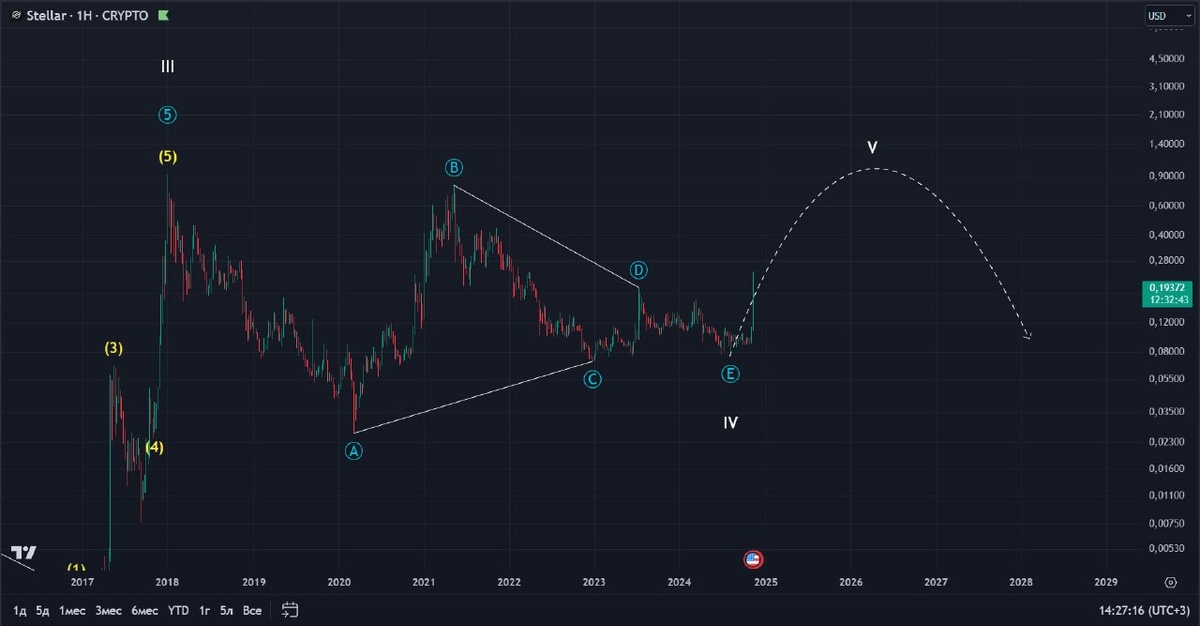 💰 Stellar Таймфрейм: W По корреляции с XRP данная криптовалюта также совершает выход из треугольника вверх, трендовая линия сопротивления пробита. Сценарий постепенно реализуется, ожидаю повышение до круглой котировки 1.00. Криптовалютой торгую на бирже Bybit. #XLM Криптовалютой торгую на бирже Bybit. #BTC