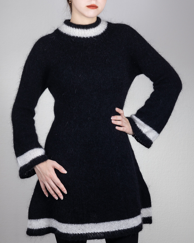 После окончания вязания прячем нитки с изнаночной стороны и проводим ВТО, сушить платье лучше горизонтально.