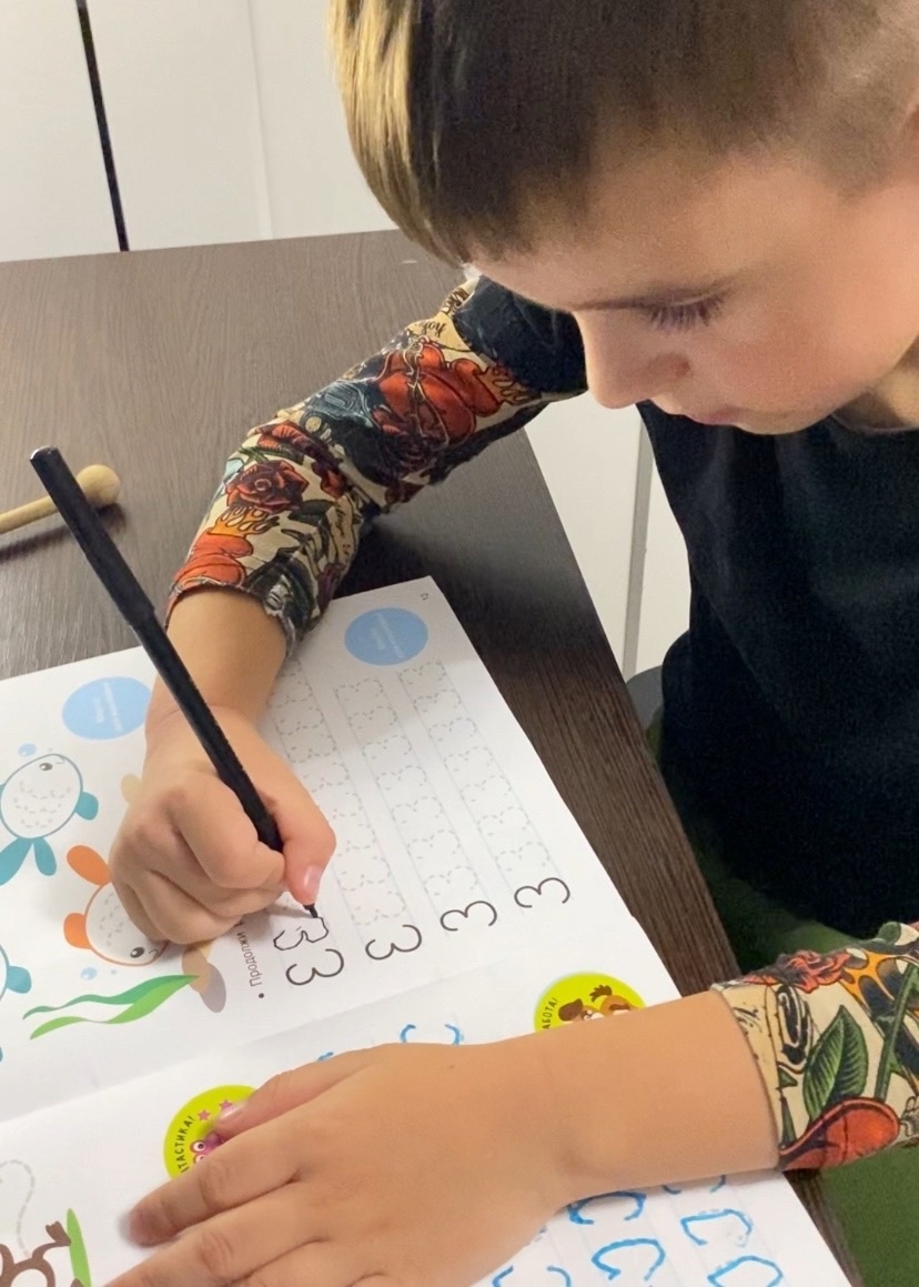 Что касается академических навыков, то с этим гораздо легче. Сейчас я большой упор делаю на мелкую моторику, тем более для речи это тоже очень полезно. Савва вырезает, раскрашивает, рисует и лепит из пластилина. Любит разные обводилки. Под это дело купила ему прописи в обычную мелкую клетку, в которых он пишет цифры в строчку. Получается замечательно, мне кажется, я так аккуратно в шесть лет не писала цифры, как сейчас пишет Савва. Закончим с цифрами, начнём прописные буквы.