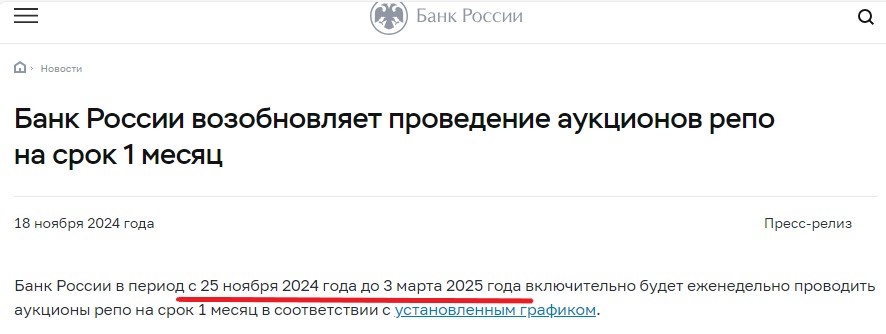 Помните, я много раз писал, что под конец года Минфин будет в принудительном порядке заставлять госбанки выкупать свои ОФЗ, которые в желаемом объеме и по таким ставкам никто не берет, а для этого ЦБ будет давать банкам целевые кредиты на их покупки? И что, по сути, это денежная эмиссия? Чуда не случилось, и все происходит именно так, как я и предполагал. Открываем сайт Центробанк и читаем официальный пресс-релиз о "возобновлении проведения аукционов репо сроком на 1 месяц". Такие аукционы, пишет ЦБ, будут проводиться с 25 ноября 2024 года по 3 марта 2025 года, еженедельно, в соответствии с установеленным графиком (график прилагается). И, самое интересное, что в новости даже прямо говорится о том, что это связано с ожидаемым усилением неравномерности распределения ликвидности между банками из-за роста бюджетных потоков, который, в свою очередь будет связан с размещением гособлигаций (!) и осуществлением повышенных расходов в конце года. Цитата: Решение о возобновлении аукционов репо на