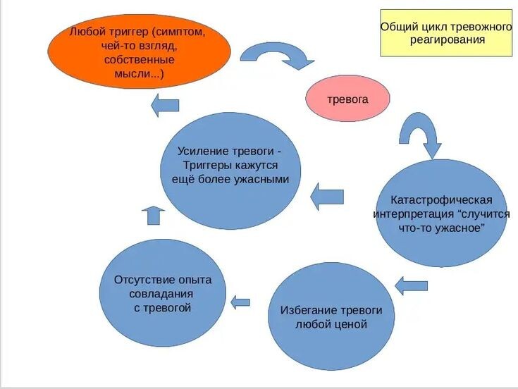 Что такое триггеры тревоги? Триггеры - это объекты, запускающие тревогу. Например, у человека тревога по поводу “повышенного давления”. Он начал из-за этого сильно переживать; стал мнительным и носит постоянно с собой тонометр. У него постоянно крутятся в голове мысли: “а вдруг давление поднимется” и от этой мысли становится тревожно - давление начинает расти. Его теперь нужно сбивать, потому что постоянные гипертонические кризы и это приводит к тому, что ему стоит только посмотреть на тонометр - и у него портится настроение при виде тонометра. То есть он подумал о том, что ему нужно мерить давление, “а вдруг оно повышено” и эта мысль начала пугать, напряжение начинает расти и этот цикл закрутился”. С чего началась тревога? Да, просто, он увидел тонометр; шел и увидел, например, машину скорой помощи и все настроение испортилось и закрутилась вся эта реакция, таким образом, триггер запускает крючок, “маховик тревоги” готов, но что-то его должно зацепить. Это может быть слово сказанное,