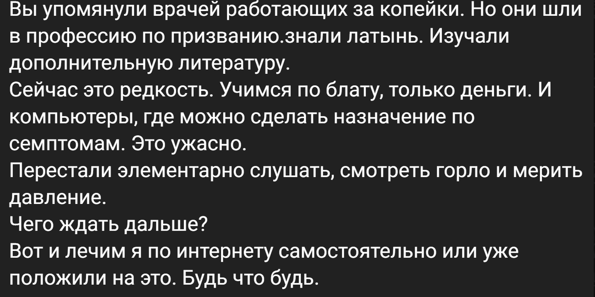 Вот приблизительно так многие сейчас видят работу врачей. Это типичный комментарий подписчиков моего телеграмм канала. Такие комментарии - обычное явление.