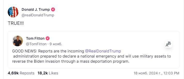 Судя по всему, Дональд Трамп не намерен отказываться от программы, благодаря которой стал новоизбранным президентом в США. Казалось бы, получив заветную путевку в Белый дом, можно расслабиться и забыть, что ты обещал электорату. Однако Трампу, видимо, хочется по-настоящему войти в историю, став ровней, скажем, Аврааму Линкольну и Франклину Делано Рузвельту. Поэтому он серьезно настроен «пошуметь». Так, 18 ноября Дональд Трамп в своей социальной сети Truth Social подтвердил: планы по массовой депортации нелегальных мигрантов не делись. Он кратко ответил «ПРАВДА!!!» («TRUE!!!») в ответ на сообщение одного из пользователей, сославшегося на информацию из администрации будущего президента. По этой информации, официально вступив в должность Трамп объявит о введении чрезвычайного положения и привлечет военных для того, чтобы выбросить миллионы нелегалов за границу. Отметим, что в ходе всей предвыборной кампании республиканцы обвиняли демократов (и кандидата от них Камалу Харрис) в намеренном