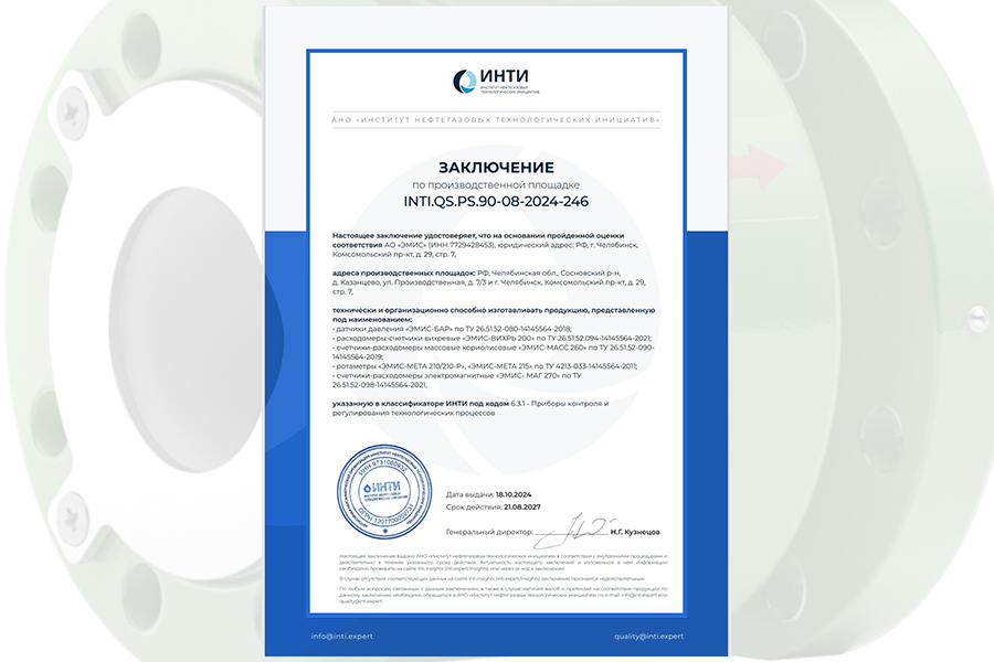 Компания «ЭМИС» получила заключение АНО «Институт нефтегазовых технологических инициатив» (ИНТИ) о соответствии производственной площадки требованиям INTI.QS.PS.90-08-2024-246. Заключение удостоверяет, что на основании пройденной оценки соответствия производственной площадки на Комсомольском проспекте 29 в Челябинске и Производственной 7 в деревне Казанцево Челябинской области АО «ЭМИС» технически и организационно способно изготавливать продукцию, указанную в классификаторе ИНТИ под кодом 6.3.1 – «Приборы контроля и регулирования технологических процессов», представленную под наименованием: - датчики давления «ЭМИС-БАР»