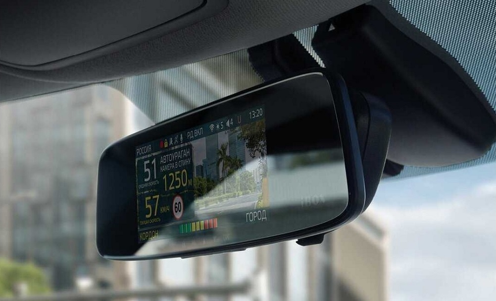 Обновление ПО и базы данных производится с помощью мобильного приложения и модуля Wi-Fi. прибор выглядит как обычное зеркало заднего вида и не занимает лишнее место на лобовом стекле, а также не привлекает внимания сторонних наблюдателей.