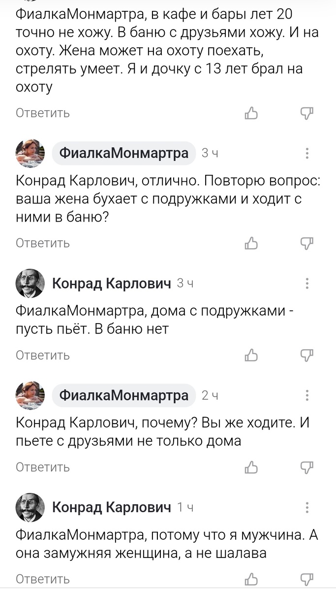 Если вы, дорогие читатели, думаете, будто прошли времена Гоши из Москвы, которая не верит слезам, то вы заблуждаетесь. Как, впрочем, и я. Вчера я узнала, что аргумент "просто потому что я мужчина" живет и здравствует до сих пор. Правда, теперь он видоизменился и действует только в части запретов для женщины. В том плане, что "нельзя потому, что она женщина". Если честно, мне казалось, что этот аргумент должен использоваться только на благо. Например, при уточнении списка профессий, запрещенных для женщин. Или в религиозных традициях - женщинам нельзя заходить в алтарь православного храма. Ну или, например, когда надо что-то тяжелое поднимать - тоже такой аргумент слышала, "ты же женщина, тебе тяжелое поднимать нельзя". А теперь я знаю, что "потому что ты женщина" запрещает женам куда-либо ходить без мужа. Я не шучу. Товарищ четко разъяснил, что он "иногда бухает с друзьями в кабинете" и "ходит в баню". Жене этого делать нельзя. Как нельзя даже просто сходить в кафешку попить кофе - про