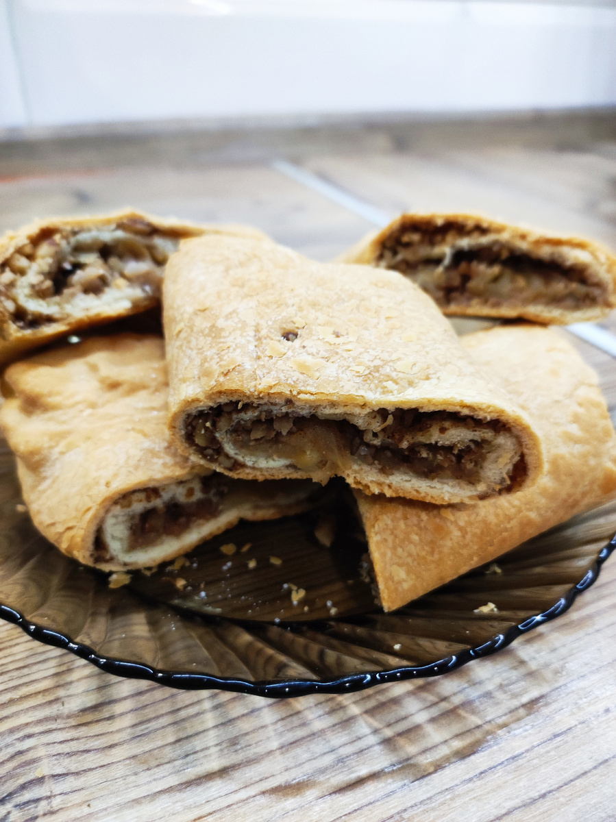 Сегодня делюсь рецептом рулета из слоеного теста с яблочно-ореховой начинкой. Простой в приготовлении, с минимальным количеством ингредиентов. Идеальный вариант для быстрого десерта! ИНГРЕДИЕНТЫ: 1. Раскатать тонко тесто. Сверху посыпать размельченными грецкими орехами, сахаром и корицей. Количество на ваше усмотрение и вкус. 2. Ближе к одному краю выложить почищенные и мелко порезанные яблоки. 3. Сверху яблок положить кусочек сливочного масла. Завернуть тесто в рулет, начиная с того края, где выложены яблочки. Края защипнуть. 4. У меня в упаковке было два листа теста. Соответственно, со вторым делаю тоже самое. 5. Ставим в разогретую духовку до 180 градусов на 40 минут. 6. Готовый рулет режем на порционные кусочки и подаем на стол! ПРИЯТНОГО АППЕТИТА!