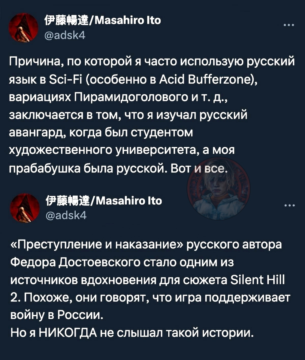 Масахиро Ито, один из создателей первых трёх частей Silent Hill, был задан вопрос о том, почему он использовал в своих работах элементы русской эстетики при создании монстров. В ответ он упомянул, что его прабабушка была русской, и он изучал русский авангард. Это стало отправной точкой для его творчества. Однако после этого в комментариях появились люди с украинскими флагами, которые начали оскорблять Масахиро, обвиняя его в русофилии и восхвалении русской культуры. При этом Масахиро ранее оказывал финансовую поддержку Украине. В результате он заблокировал около 70 украинских аккаунтов и заявил, что теряет мотивацию продолжать помогать Украине. Также Масахиро упомянул, что «Преступление и наказание» Фёдора Достоевского послужило одним из источников вдохновения для сюжета Silent Hill 2. Наша игра получается?