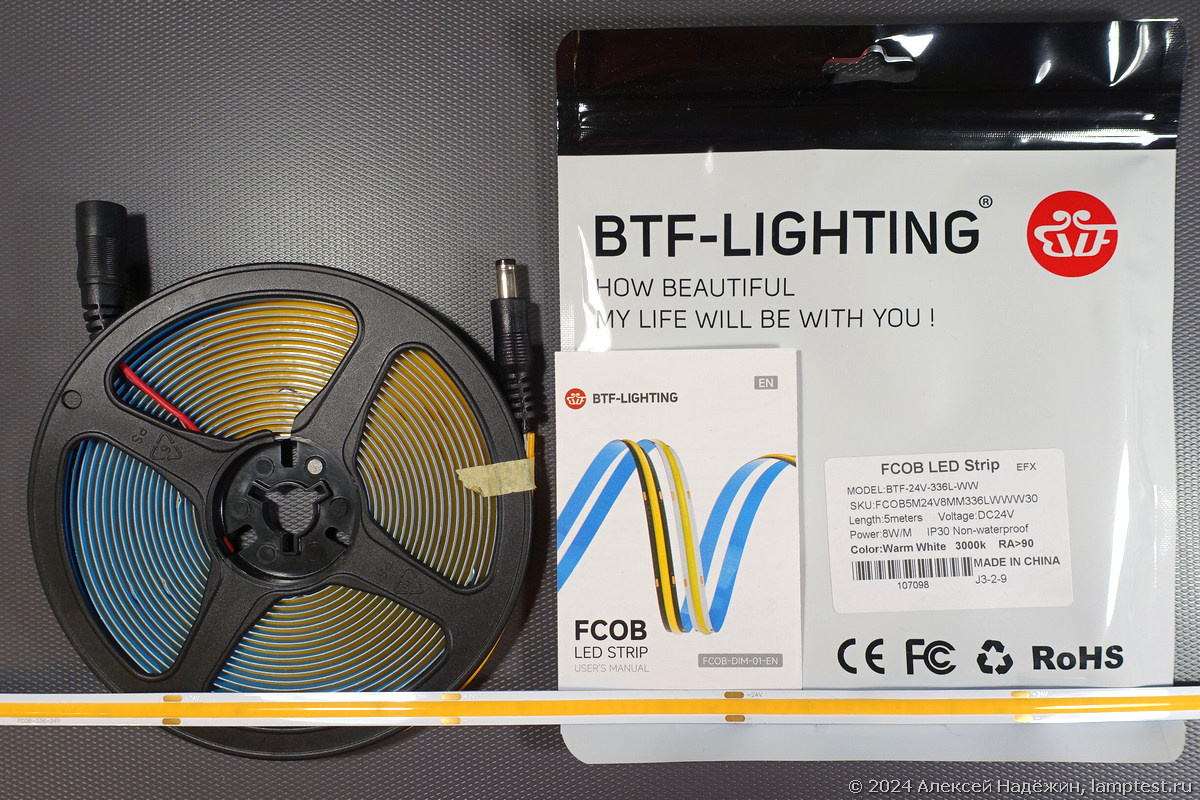 BTF lighting наверное самый известный производитель светодиодных лент на AliExpress. Купил и протестировал ленту FCOB с заявленным высоким индексом цветопередачи. Технология FCOB (Flip Chip on Board) во многом аналогична технологии филаментных светодиодных ламп: на ленте установлено множество маленьких синих светодиодов, покрытых общей полосой люминофора, преобразующего свет в белый. Свет такой ленты более равномерный, нагрев меньше, чем у традиционных лент той же мощности, эффективность выше. Лента пришла в фирменном пакете с наклейкой, на которой указаны основные параметры: Модель: FCOB-24V-336L-WW-IP30