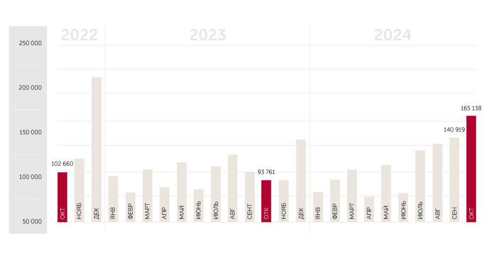 На сайте Turkish Statistical Institute представили официальные данные за первые 10 месяцев года. В октябре 2024 года в Турции провели 165,14 тыс. сделок. Показатель на 76% больше, чем в октябре 2023 года. За десять месяцев продажи жилья выросли на 12%, превысив 1,112 млн лотов. При этом покупки за собственные средства занимают 87% рынка и составляют почти 1 млн объектов. Сделки с новостройками составили 35% всех продаж. Иностранцы купили чуть более 1% от всего объема сделок. Больше всего объектов по-прежнему покупают граждане РФ. Подробнее о ситуации на рынке недвижимости Турции читайте в статье — Рынок недвижимости Турции в октябре 2024 года. Наш сайт: https://barnes-moscow.com/ Получить консультацию: +7 (495) 106-87-98