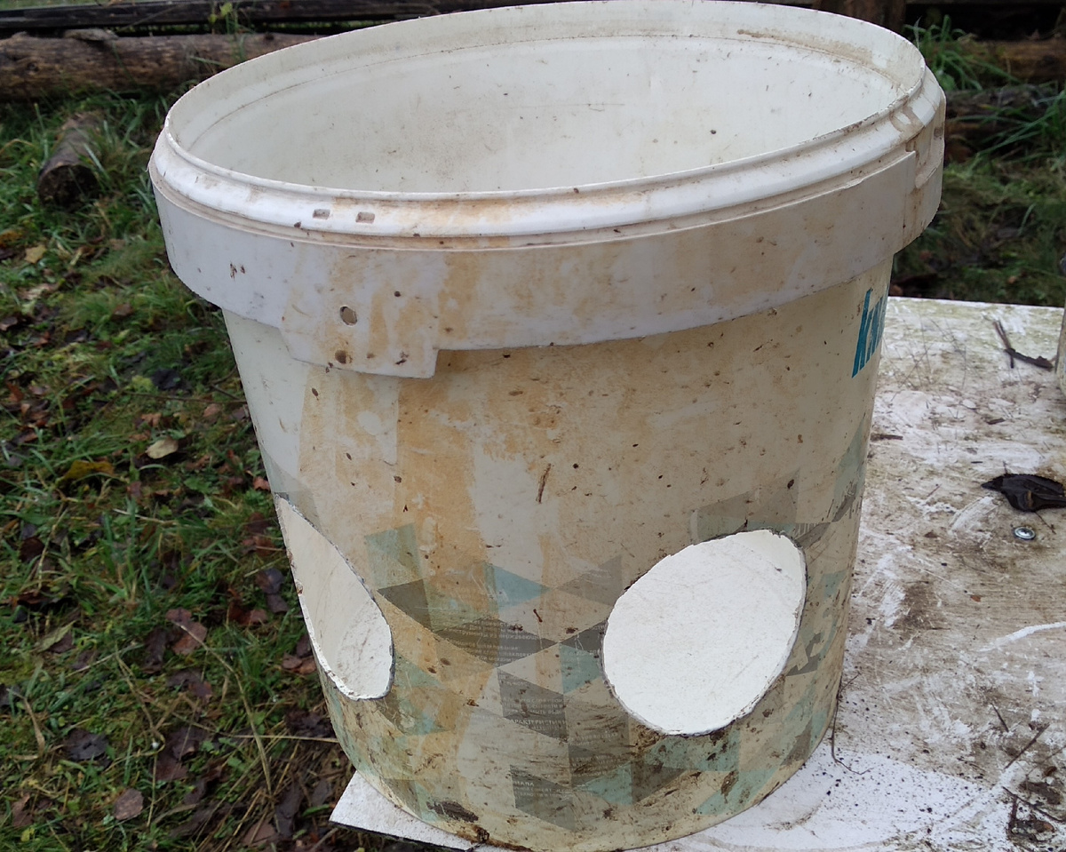 Сейчас многие заводят домашнюю птицу. Даже дачники на теплый сезон берут кур. В моем хозяйстве живут 9 кур и 3 индоутки. Держим живность для собственных нужд, чтобы были свежие яйца и мясо. Содержать птицу оказалось довольно не обременительно и очень интересно. Сейчас можно оснастить курятник и ниппельными поилками и бункерными кормушками - все есть в продаже. Но гораздо проще и дешевле сделать, например, кормушку своими руками. Я сделала за полчаса бункерную кормушку из пластикового ведра и 19 л бутыли от воды. Сначала размечаем и вырезаем в ведре отверстия. У меня получилось 5 штук диаметром 10 см. Отверстия вырезаем на высоте не менее 7-10 см от дна, чтобы корм меньше высыпался на землю. У меня бортик всего 6 см и это явно мало. Края отверстий слегка заглаживаем наждачкой, чтобы птица не поранилась. На такое ведро бутыль от воды садится плотно. Но горлышко получается очень высоко от дна: Горлышко бутылки должно быть как можно ниже, чтобы корм из него высыпался понемногу. Поэтому де