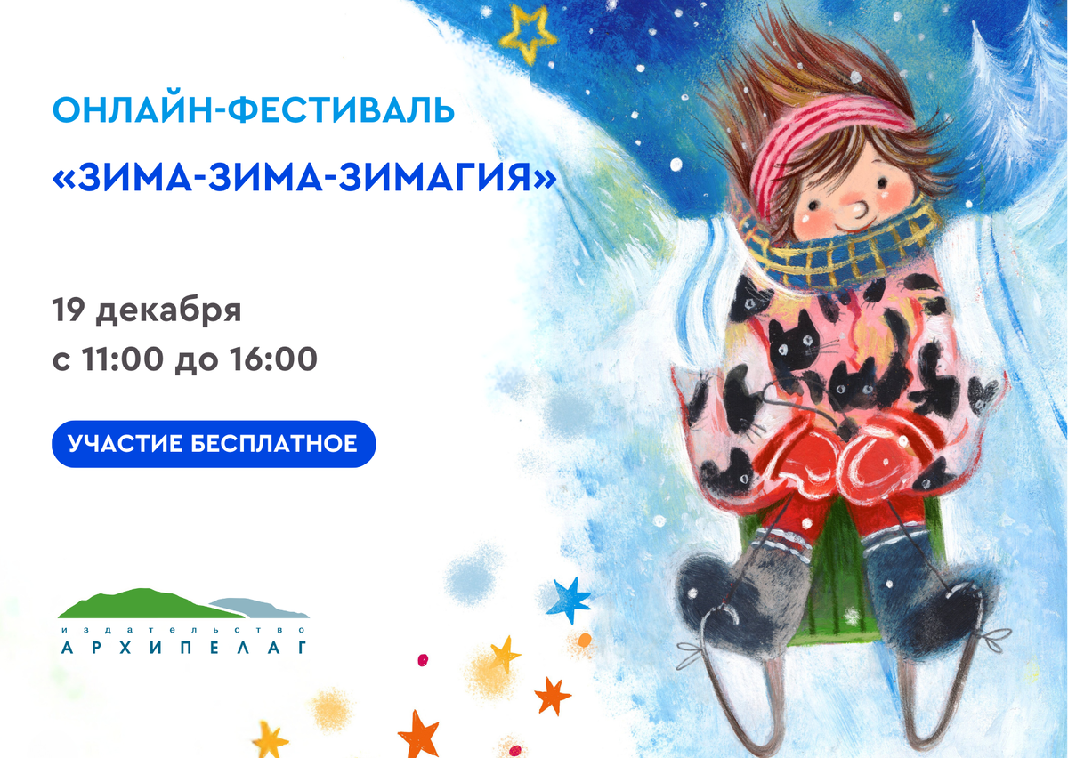 Новогоднее настроение само себя не сделает! Но можно зарядиться волшебством и праздничной атмосферой. И для этого мы приглашаем вас на онлайн-фестиваль «Зима-зима-зимагия», на котором выступят писатели, художники и другие волшебники издательства «Архипелаг». Что вас ждёт на фестивале? ✅ Чтение новогодних стихов и отрывков из книг Ксении Валаханович, Игоря Шевчука, Михаила Лукашевича, Марины Тараненко, Ирины Иванниковой, Зули Стадник, Юлии Кузнецовой, Юлии Весовой, Ирины Дружаевой. ✅ Мастер-классы от художников и писателей: Зины Суровой, Вадима Челака, Нины Павловой, Виктории Топоноговой, Дианы Лапшиной, Светланы Коротковой. 🌟 Вы узнаете, с кем лучше встречать Новый год – со змеёй или с кошкой, услышите секреты овощей на новогоднем столе, а также сделаете собственный календарь на следующий год! Для кого этот фестиваль? Фестиваль пройдёт 19 декабря с 11:00 до 16:00. Участие бесплатное, зарегистрироваться можно здесь: https://events.archipelag-publishing.ru/.