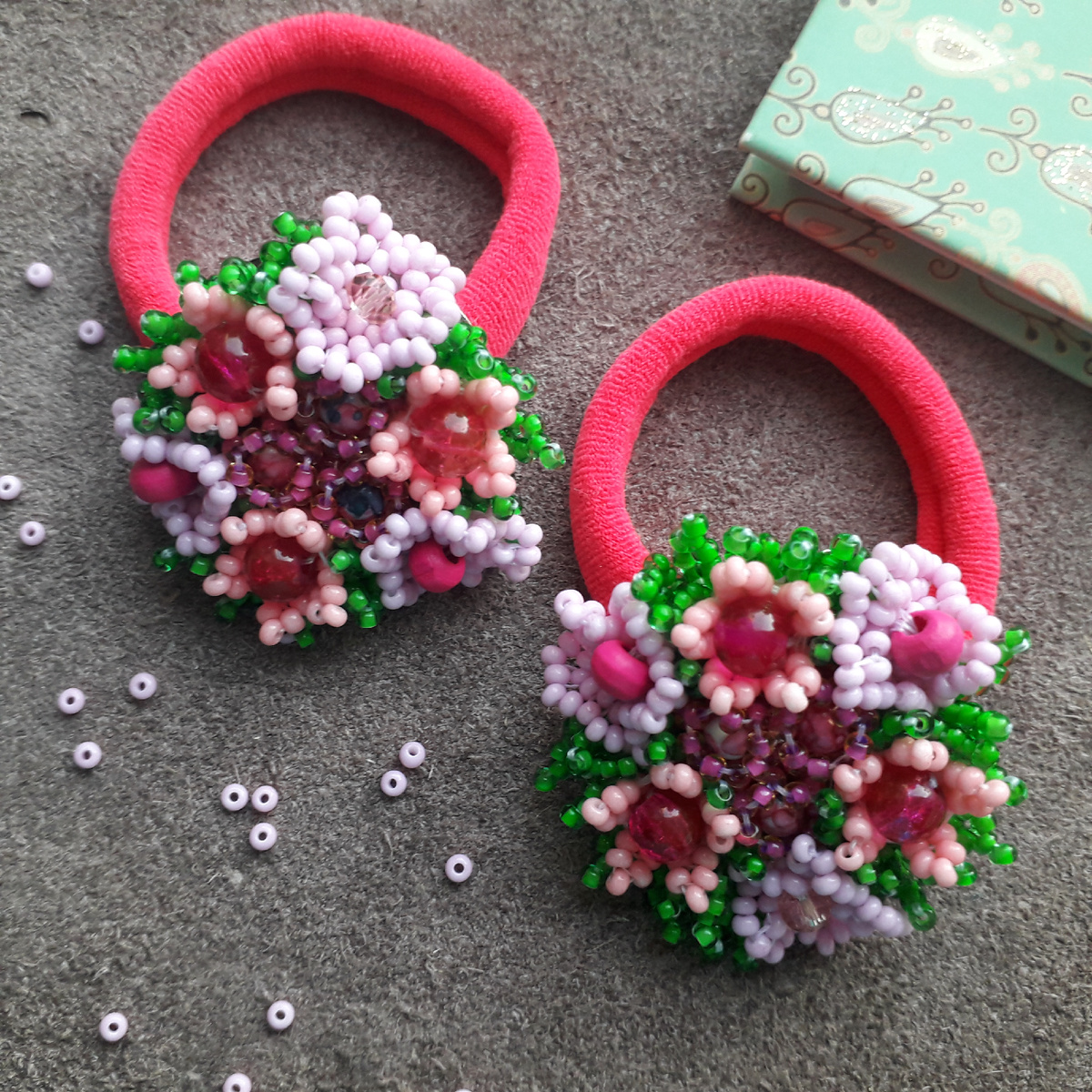 Нам понадобится бисер 12/0 желательно трех оттенков для цветов и один оттенок зеленого, резинка для волос, нить для бисера, основа для броши, фетр, бусины 5-6 мм., бусины 3 мм., игла №12. Если вы хотите, чтоб была возможность сменить резинку, когда она растянется, то тогда понадобятся еще колечки. 3 штуки на одну резинку. Цветочки плетутся отдельно, потом все собирается на основе для броши. Процесс плетения на видео: