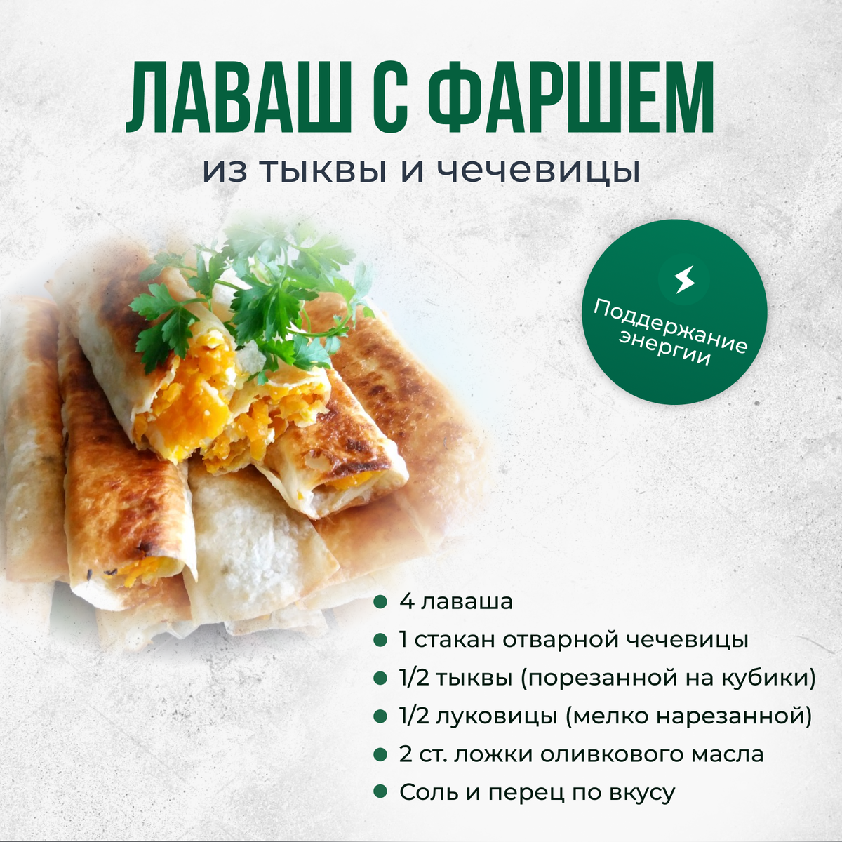 Этот рецепт помогает поддерживать уровень энергии благодаря белкам и углеводам. Ингредиенты: 4 лаваша 1 стакан отварной чечевицы 1/2 тыквы (порезанной на кубики) 1/2 луковицы (мелко нарезанной) 2 ст. ложки оливкового масла Соль и перец по вкусу Инструкция: Запеките тыкву в духовке до мягкости (15-20 минут при 180°C). В сковороде разогрейте оливковое масло, обжарьте лук, добавьте чечевицу и запеченную тыкву, посолите и поперчите. Наполните лаваши начинкой и сверните в рулеты. Изюминка: Подавайте с соусом на основе йогурта и зелени для пикантности. Лаваш с фаршем из тыквы и чечевицы — это вкусное и питательное блюдо, которое обеспечивает долгую сытость и поддерживает уровень энергии.