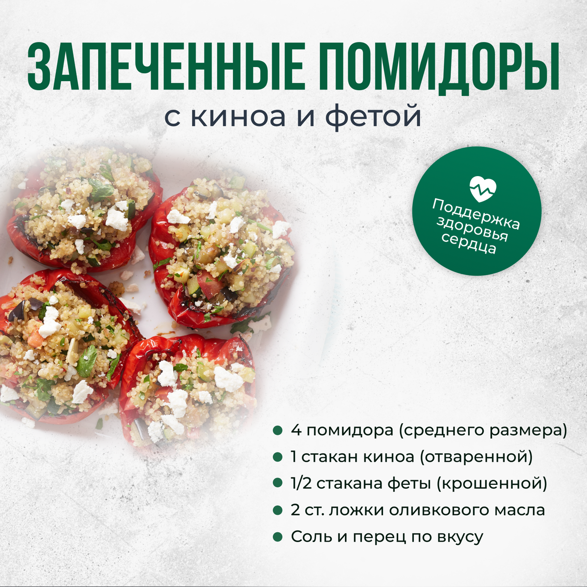 Это блюдо поддерживает здоровье сердца благодаря антиоксидантам в помидорах и полезным жирам в оливковом масле. Ингредиенты: 4 помидора (среднего размера) 1 стакан киноа (отваренной) 1/2 стакана феты (крошенной) 2 ст. ложки оливкового масла Соль и перец по вкусу Инструкция: Разогрейте духовку до 200°C. Вырежьте верхушку помидоров и аккуратно удалите мякоть. Смешайте отваренную киноа с фетой, посолите и поперчите. Наполните помидоры начинкой, полейте оливковым маслом и запекайте 20-25 минут. Изюминка: Посыпьте свежим базиликом перед подачей для дополнительного аромата. Запеченные помидоры с киноа и фетой — это вкусное и сытное блюдо, которое насыщает организм витаминами и минералами, идеально подходящее для здорового ужина.