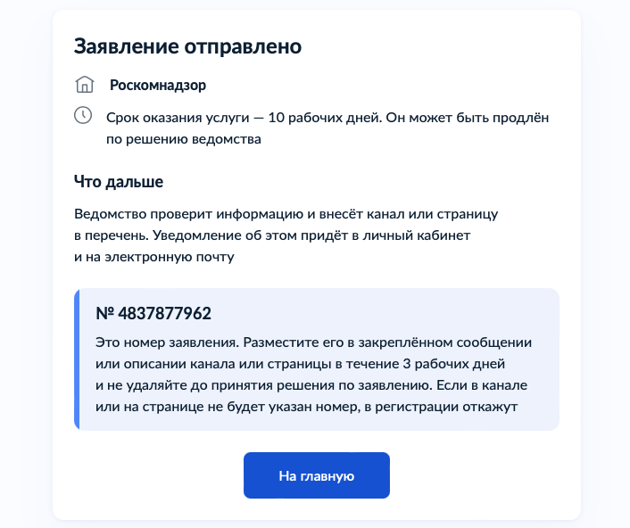 Заявление на регистрацию канала в Роскомнадзоре № 4837877962