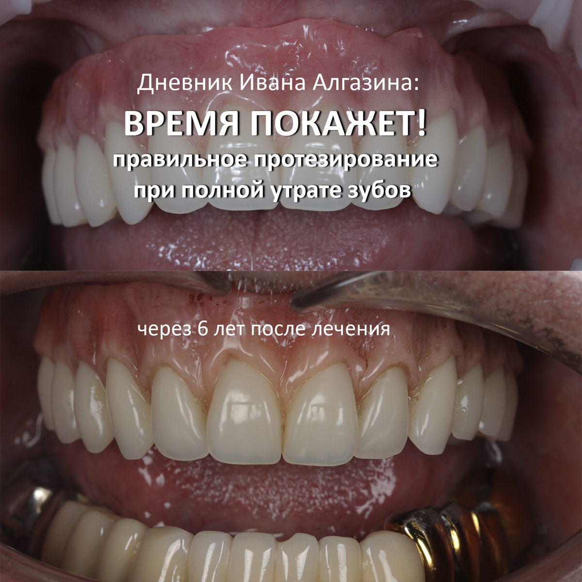 Дорогие друзья, давеча мы рассказывали вам о проблемах протезирования при полном отсутствии зубов и том, как мы эти проблемы решаем. Сегодня я хочу показать вам одну из своих первых работ в этом направлении. В то время, когда все только начинали онанировать на All-On-4 («всё-на-четырех»), мы, наигравшись с несъемным протезированием с опорой на четыре имплантата, насмотревшись на осложнения и проблемы, которые этот вид протезирования сопровождают, выбрали для себя другой путь. А именно — не просто восстановить отсутствующие зубы, но и обеспечить возможность для удобного ухода и комфортного использования. Наша задача — поднять качество жизни. Это невозможно, если пациент мучается с гигиеной, не может прочистить протез, борется с воспалением десны и периимплантитом из-за плохой гигиены и смотреть без слез не может на получившийся «эстетический результат».