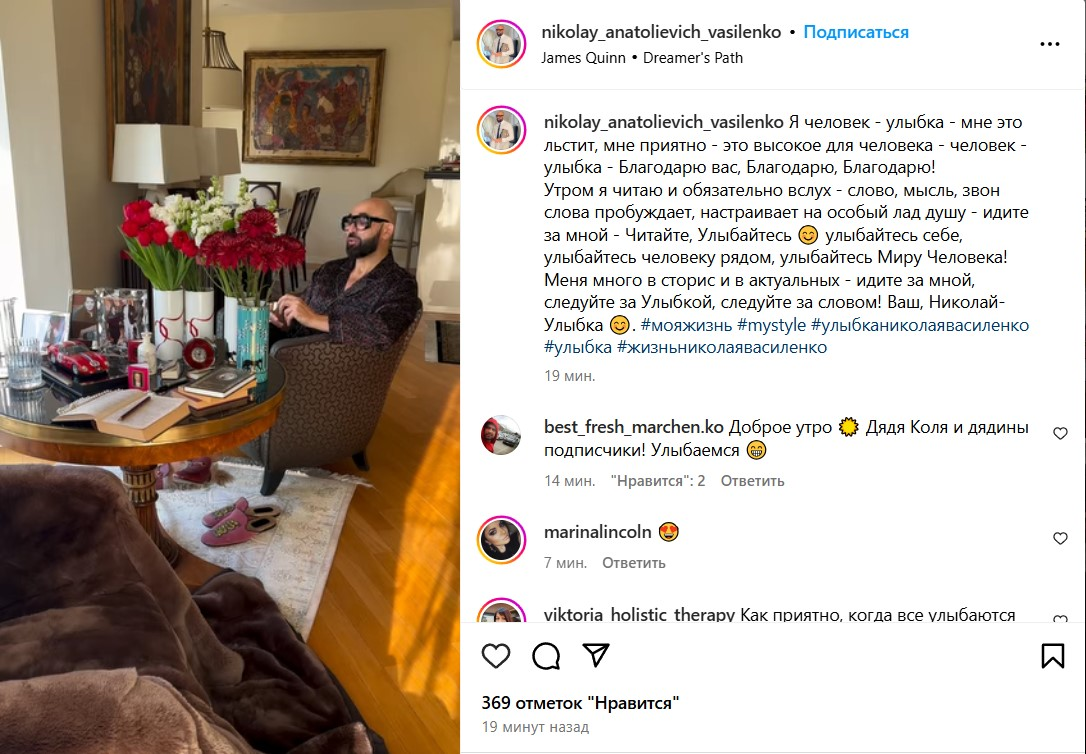 Ростовский бизнесмен Николай Василенко — настоящий амбассадор позитива и умиротворения. Воплощение лавандового рафа и ромашкового чая, он покорил сердца многих своей способностью создавать атмосферу доброты и радости. Осенью этого года он стал настоящим интернет-героем, записывая короткие видео с широкой белоснежной улыбкой, в которых желает всем хорошего дня и призывает радоваться каждому моменту жизни. Его усилия не прошли незамеченными — он пробил отметку в 1 миллион подписчиков, хотя ведет блог уже несколько лет. Николай делится с подписчиками своей насыщенной и изысканной жизнью. Его посты наполнены классической музыкой, нарядами люксовых брендов, живыми цветами и произведениями искусства. Он не стесняется призывать своих поклонников читать вслух поэзию и прозу, добавляя в их жизнь немного культуры и вдохновения. Его питомцы — лабрадор Николь и британский кот Шерлок — также иногда становятся героями его видео, добавляя уюта и тепла. В своих роликах Василенко нарочито демонстрирует