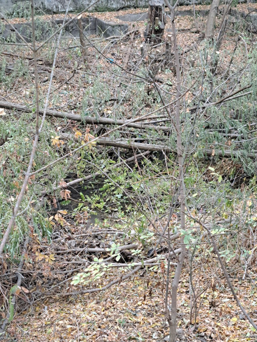 Так у небольшого сквера в Камбициевке, около дома №37 по улице Дзержинского (местные называют забавным словом "Степок") муниципальные службы подстригли деревья. И все бы хорошо - но деревца оказались брошены в речку, проходящую рядом.
