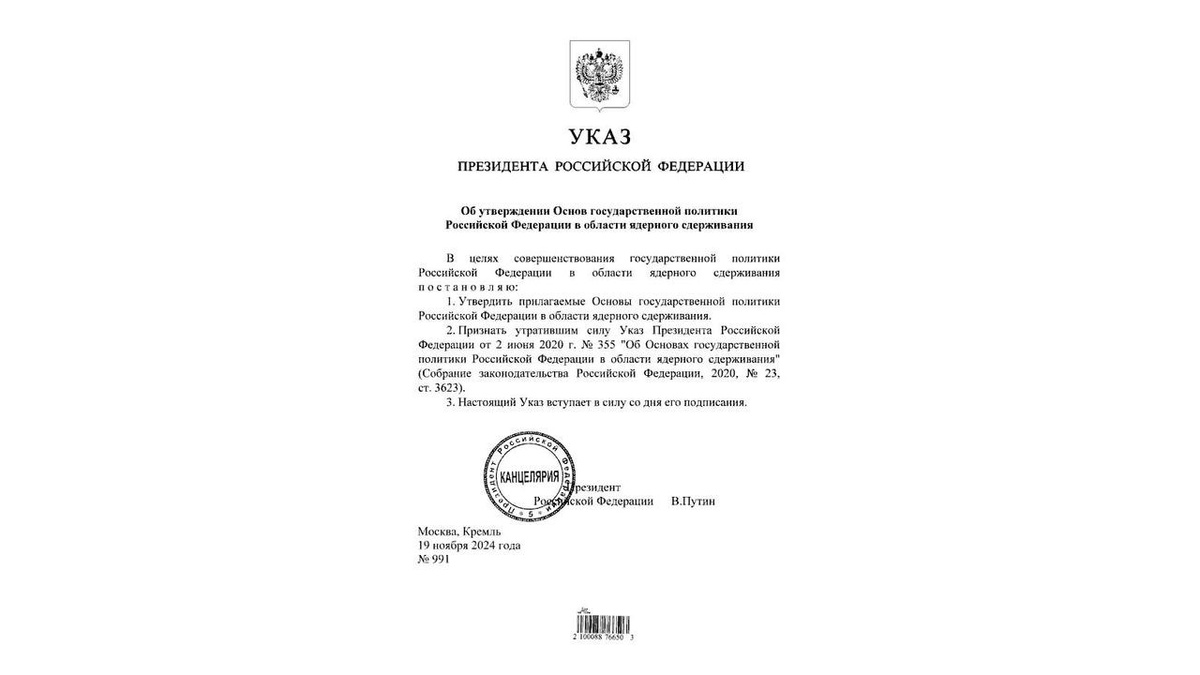 Президент России Владимир Путин подписал указ, утверждающий обновленную ядерную доктрину – Основы госполитики в области ядерного сдерживания, сообщает ТАСС. В основе концепции лежит идея о том, что ядерное оружие — это крайняя мера для защиты независимости страны. Однако в условиях новых военных угроз и рисков России необходимо уточнить условия, при которых допустимо использование ядерного оружия. В концепции расширен список стран и военных союзов, в отношении которых применяется ядерное сдерживание. Также дополнен перечень военных угроз, для предотвращения которых необходимы такие меры. Если неядерное государство будет действовать в союзе с ядерной державой, это будет рассматриваться как нападение на Россию. Кроме того, Россия может применить ядерное оружие в следующих случаях: